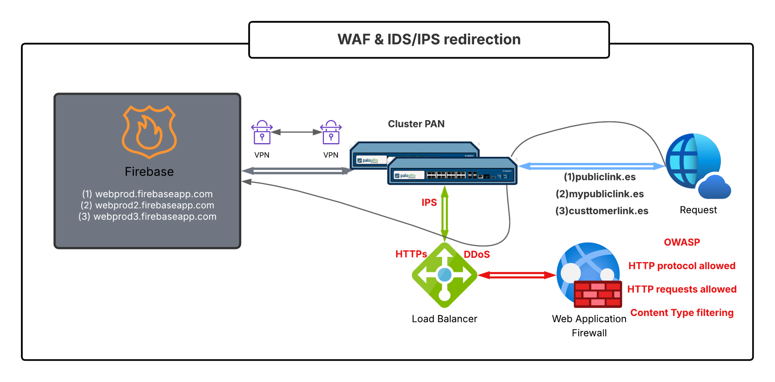 To overcome a series of security scans, it was necessary to redirect traffic from clients requiring a service hosted on Google Firebase, as there was no specific protection against hacking attacks. The process, whose solution is presented with the anonymized diagram above, consisted of:
